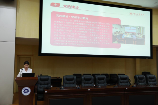 大会第一项,办公室陈蓓老师作5月份学校工作回顾总结。5月我们追梦前行,开拓进取,开展了“福建省陶行知实验学校”授牌仪式、第六届技能节、职工学堂、实地调研走访等一系列职教周活动。我校 21 高职模具谢烜同学作为100 名中等职业教育国家奖学金获奖学生优秀代表,荣登 5 月4 日出版的人民日报。我校“花里拾“遗”,情系海丝——用非遗缠花开拓“一带一路”新兴市场” 项目以福建省网评成绩第一名进入第七届中华职教社创新创业全国总决赛。