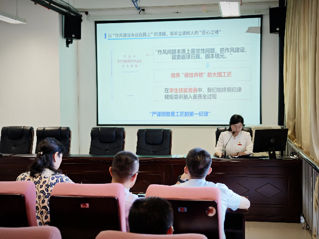 教务处副主任陈晓君以《深入贯彻中央八项规定精神 锻造集工教育战线过硬作风》为题,深刻剖析中央八项规定精神在教育领域的实践内涵,结合教育教学实际,在会议上深入阐述该精神对教育领域的重要意义。