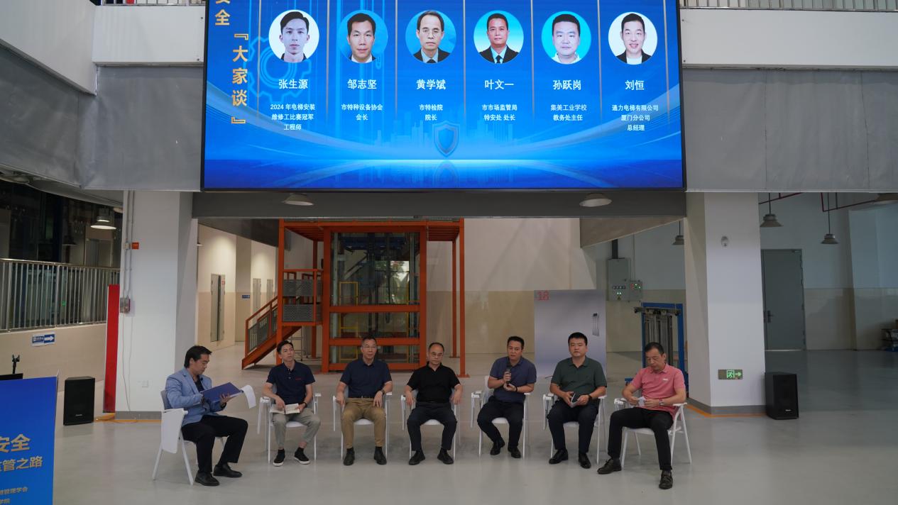 在沙龙共话环节,厦门市市场监管局特安处处长叶文一、厦门市特检院院长黄学斌、集美工业学校教务处主任孙跃岗、厦门市特种设备协会会长邹志坚、通力电梯有限公司厦门分公司总经理刘恒及电梯安装维修工比赛冠军工程师张生源等嘉宾,围绕“电梯安全‘大家谈’”主题展开了热烈讨论。嘉宾们从不同角度分享了电梯安全监管、技术创新、人才培养等方面的见解和建议,现场互动问答环节气氛热烈,大家积极提问,嘉宾们耐心解答,共同为电梯安全监管事业贡献智慧与力量。