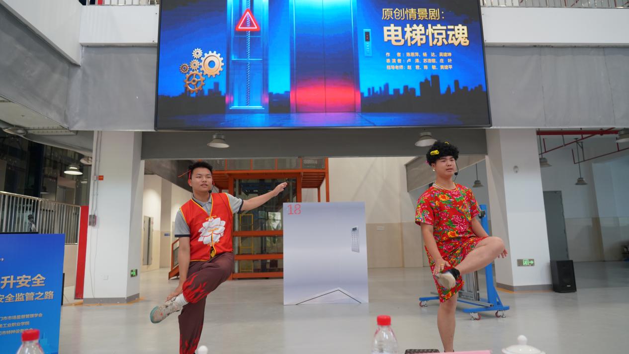集美工业学校学生带来的原创情景剧《电梯惊魂》精彩上演,生动再现了电梯故障场景,引发了现场观众对电梯安全问题的深刻思考。