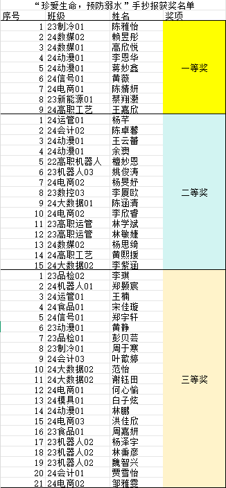 比赛通知发布后,同学们热情高涨,纷纷投入到手抄报的创作中。他们以“防溺水”为主题,充分发挥自己的想象力和创造力,从防溺水知识科普、溺水案例警示、自救互救方法等多个角度入手,精心设计版面、挑选素材、书写文字。评选环节,闽南文化产业系石江惠副主任带领美术组的老师们共同进行。老师们秉持着公平、公正、公开的原则,从手抄报的主题契合度、内容丰富度、版面设计、色彩搭配等方面进行了细致的评审。经过层层筛选,最终评选出一等奖 9 名、二等奖 15 名、三等奖 21 名。