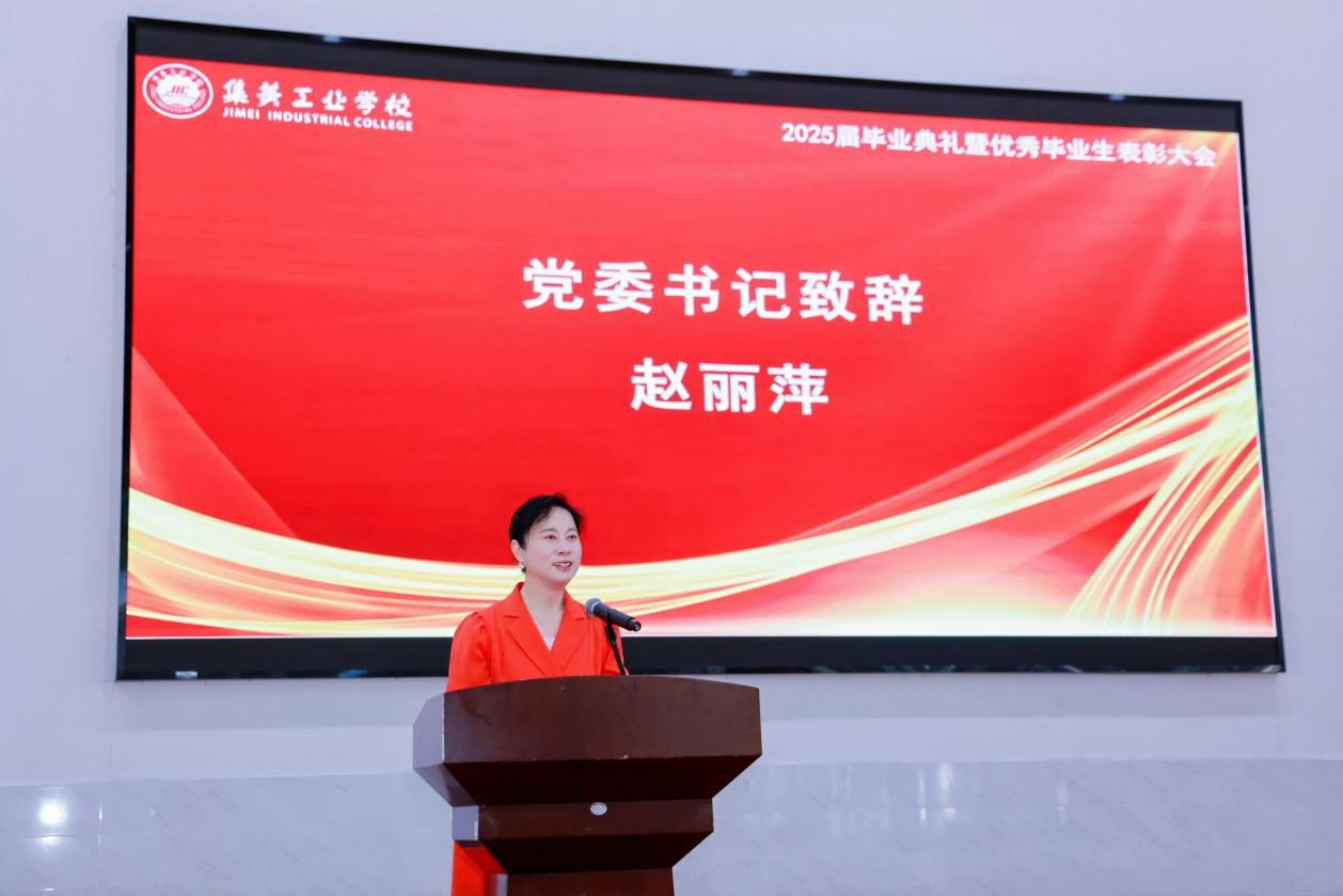 校党委书记赵丽萍代表学校,向圆满完成学业的2025届全体毕业生表示最热烈的祝贺!同时,向倾注心血的老师和家长们,致以最诚挚的感谢!在致辞中,赵书记以校训“诚毅勤美”为脉络,勉励毕业生以“诚毅”为根,立世先立德,让高尚品德成为行走社会的“通行证”;以“勤”为翼,匠心筑梦行,成为行业需要的“能工巧匠”;以“美”为志,知行共奋进,将个人成长融入“制造强国”的蓝图,在服务地方经济中实现价值。