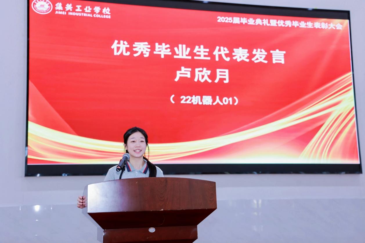 典礼现场,22机器人01卢欣月同学作为优秀毕业生代表发言。她代表2022级毕业生回顾了在集美工业学校的成长历程,表达了对师长的感恩之情,更展现了工校学子勇立潮头的决心。