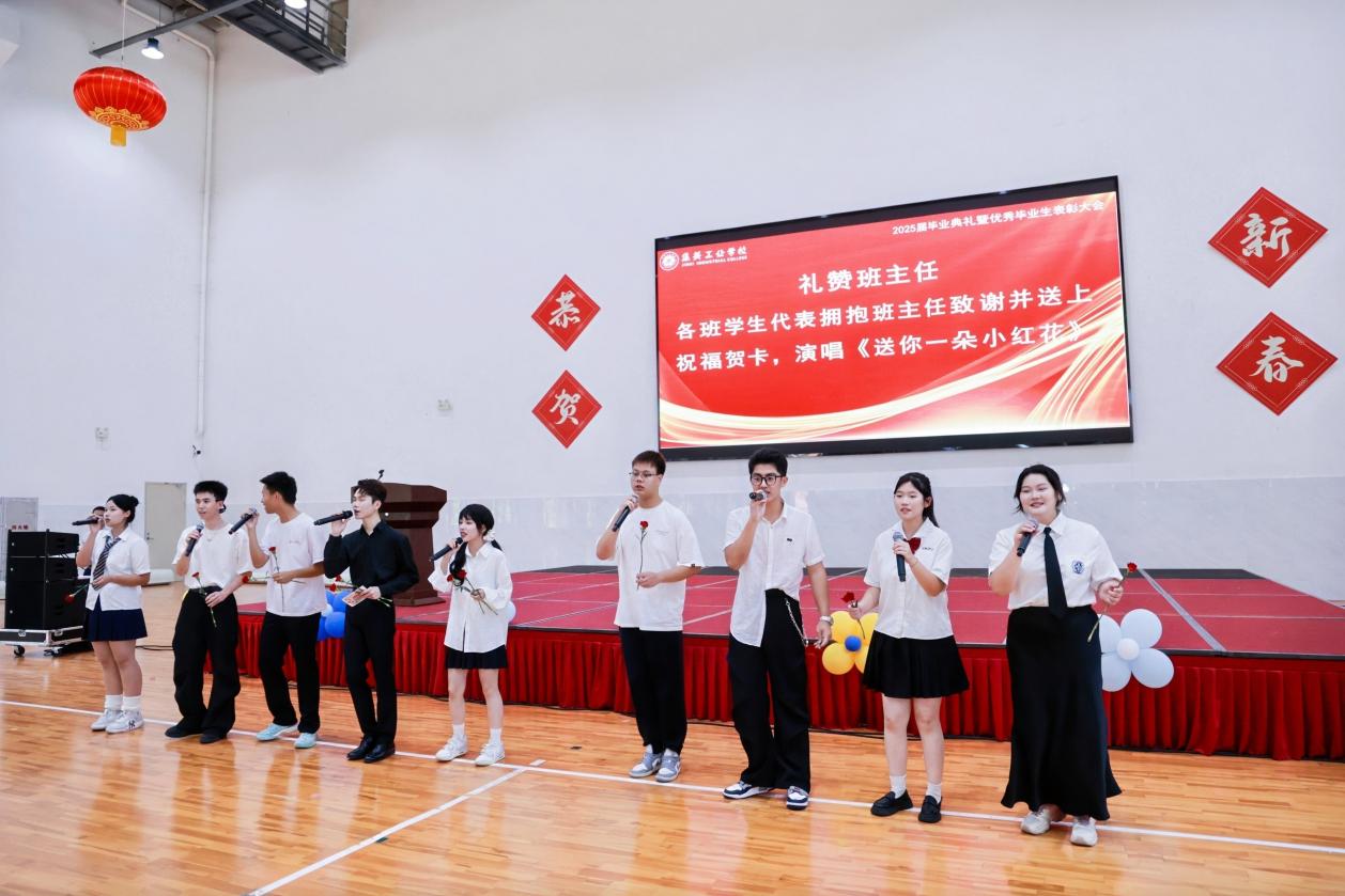 典礼特别设置“感恩致谢”环节,学生代表以一曲《送你一朵小红花》诉说对班主任的深情,各班学生代表手捧鲜花与定制贺卡,与朝夕相伴的老师深情拥抱。随后,毕业生代表向辅导员、教官及保安、保洁、食堂员工代表鞠躬献花,感谢他们三年来的默默守护。