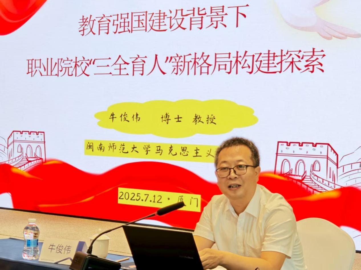 闽南师范大学牛俊伟教授以《教育强国建设背景下职业院校“三全育人”新格局构建探索》为题,解码“三全育人”实践路径,为深化教师对“全员、全过程、全方位育人”的理解。牛教授结合案例,从“课程思政如何融入学科教学”“校园文化如何浸润学生心灵”“家校社协同育人如何落地”等维度,系统解读了“三全育人”的实施策略。他强调,德育不应局限于课堂,需渗透到学生学习生活的每一个环节,通过全员参与、全程贯穿、全域覆盖,构建“大思政”格局。