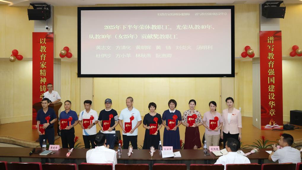 表彰环节是大会核心亮点。欧阳超副校长宣读《关于公布2024-2025学年先进集体及各级各类先进个人表扬名单的通知》,陈飞副校长宣读《关于表扬光荣从教40年、从教30年(女25年)贡献奖的决定》,随后颁奖仪式有序举行:校领导分别为下半年荣休教职工、光荣从教40年、从教30年(女25年)贡献奖教职工、校级以上先进代表、校级“两优一先”获奖代表以及校内各级各类先进集体与个人代表颁奖。沉甸甸的证书与热烈的掌声,既是对获奖者的肯定,也为全体教职工树立了学习榜样。