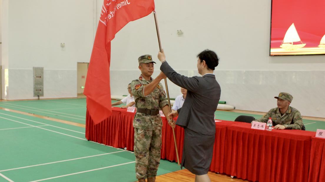 大会现场还举行了庄重的军训旗帜授予仪式,赵丽萍将军训旗帜郑重交予军训教官代表,象征着本次军训任务正式启动。