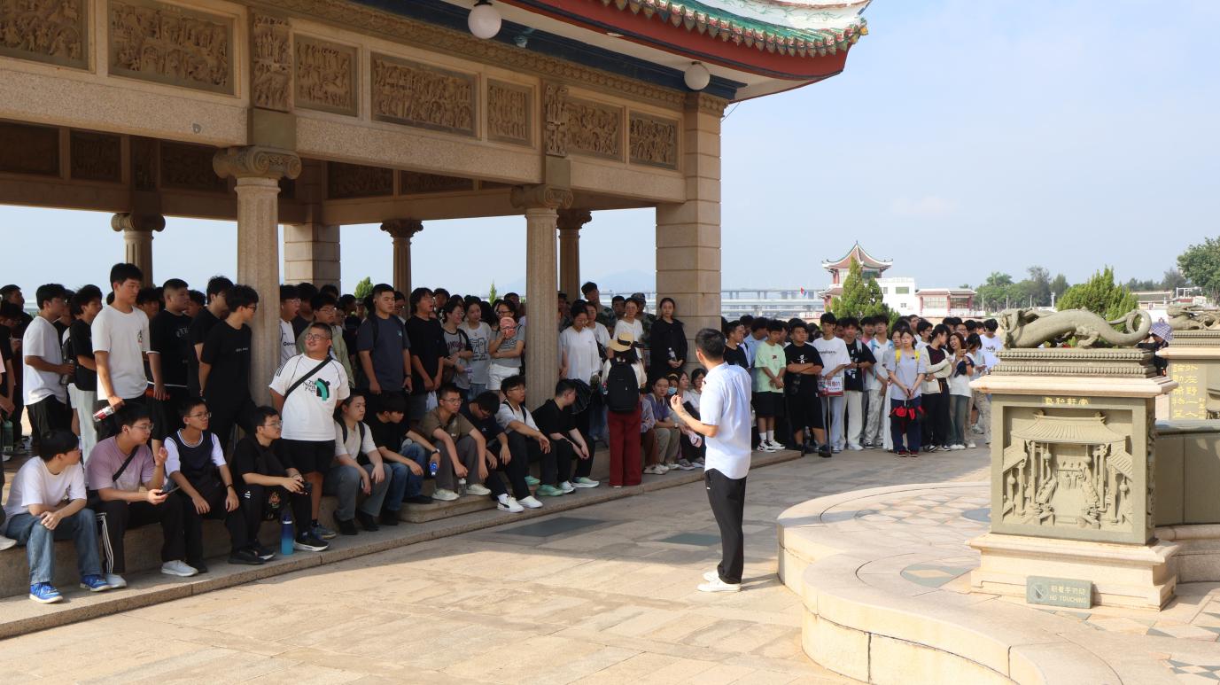 在鳌园,学子们不仅与百余幅精美石雕群“对话”,更在讲解中聆听陈嘉庚先生的动人故事。陈嘉庚先生早年背井离乡赴南洋,在艰苦创业中站稳脚跟,事业有成后始终心系祖国,将资产尽数投入教育与革命事业,为民族解放和教育发展立下不朽功勋。同时,还解读了鳌园建筑与先生的关联——集美解放纪念碑的设计寓意、陈嘉庚墓呈龟形的缘由,让学子们在了解故事的同时,更懂建筑背后的精神内涵。这些镌刻着历史故事与教育理念的石材,既是闽南建筑艺术瑰宝,更承载着陈嘉庚先生“倾资兴学、爱国爱乡”的赤子之心。驻足凝视间,先生奔走海内外、以实业养教育的身影仿佛浮现,让“教育为立国之本”的信念变得可触可感。