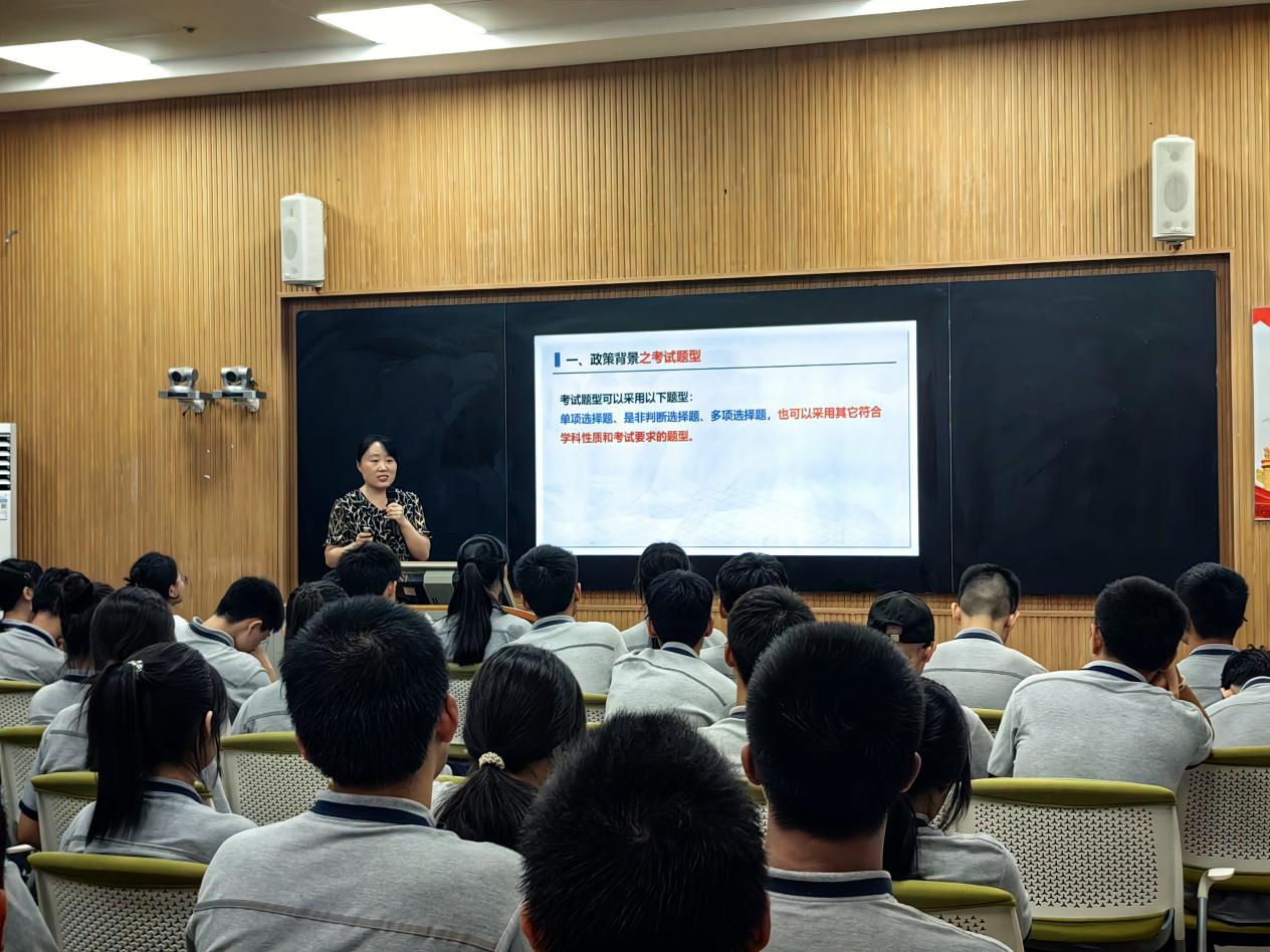 思政学科由王晓丽老师主讲,她解读了思想政治考纲新变化:单科满分100分,实行70分钟闭卷考试,题型包括单选、判断、多选。考试内容涵盖《中国特色社会主义》《心理健康与职业生涯》《哲学与人生》《职业道德与法治》四本教材及考试前一年度的时事政治,其中《中特》考点占比最高。她建议学生利用模拟考试养成圈画关键词、仔细检查答题卡等良好习惯,关注年度重大时事。备考方面她提出夯实基础、构建知识体系、及时练题整理错题、掌握答题技巧、积累关联考点的成语诗句等方法,为学生备考提供清晰路径。