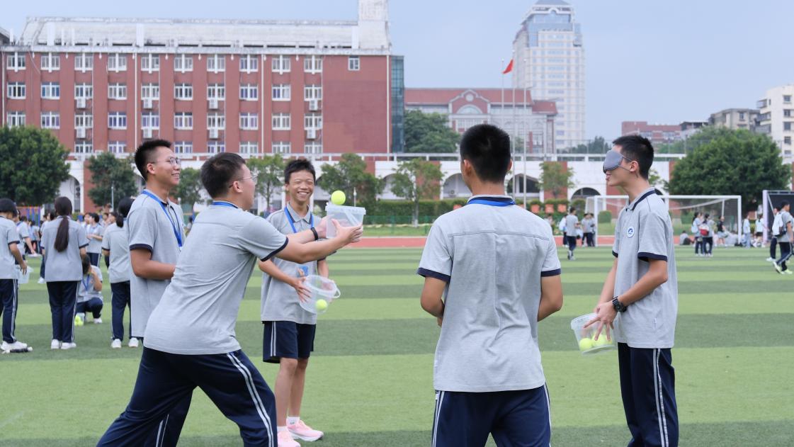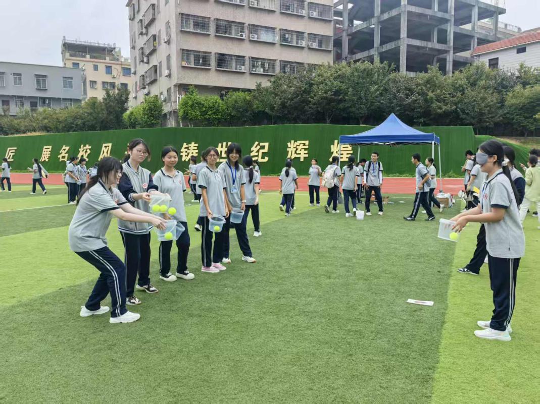 活动当天,6个特色关卡依次排开,各小队手持闯关卡,满怀期待开启挑战。“听声辩位”环节,蒙眼同学屏息倾听喇叭方向,周围伙伴的轻声提示与猜对后的欢呼交织成趣;“盲投心接”中,蒙眼同学稳稳投球,队友们默契配合用桶承接,球入桶的瞬间总能引来阵阵喝彩;“筷子兄弟”考验细致与耐心,队员们小心翼翼夹球传递,彼此鼓劲的声音不绝于耳;“守住盘中餐”时,众人同步抖布颠球,整齐的节奏口号与稳步前进的身影,尽显团队默契;“电流穿梭”环节,手拉手的同学们灵活传递呼啦圈,肢体互动间悄然消融了陌生感;“稳心垫渡”中,协助者快速递换垫板,行进者稳步向前,成功抵达终点时的击掌庆祝,成为青春里温暖的瞬间。