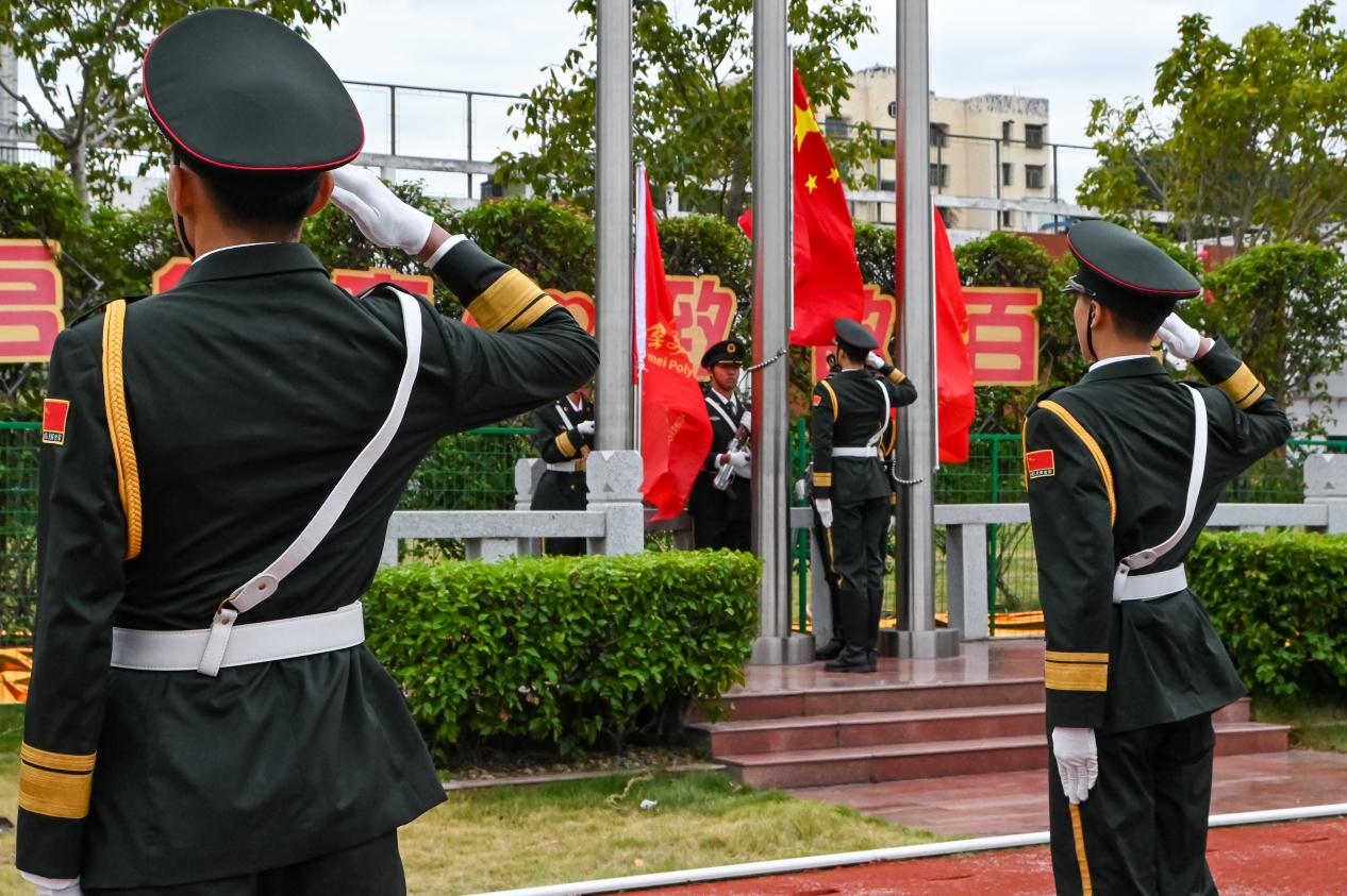 升旗仪式环节,五星红旗在雄壮的国歌声中冉冉升起,校旗随后也在悠扬的校歌声中徐徐升起,共同昭示嘉庚精神与体育精神的交融传承。