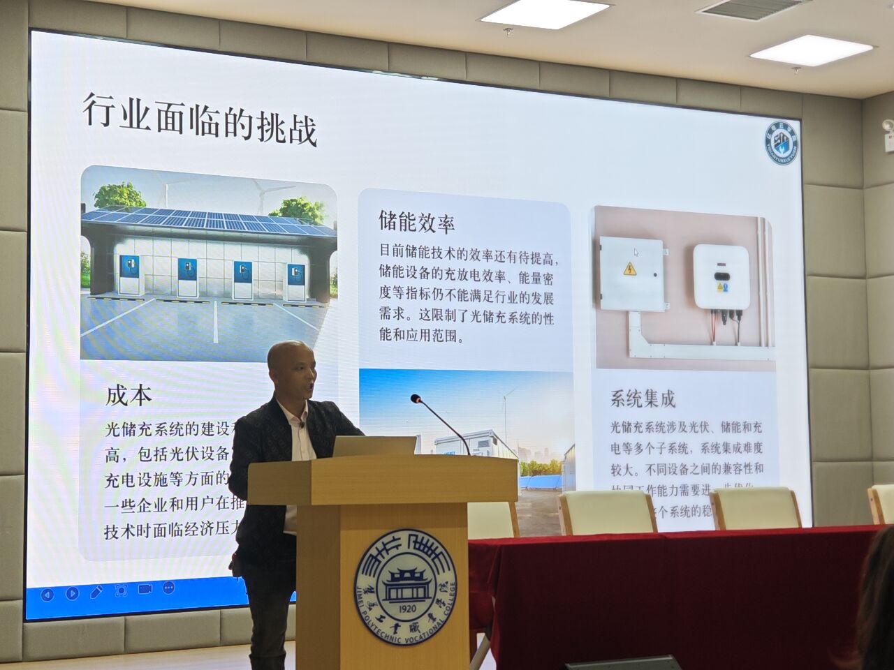 在理论宣讲环节,深圳市亿电云技术有限公司负责人屈零地以光伏发电技术为核心,结合新能源汽车行业发展趋势,展开了系统讲解。宣讲中,他从光伏发电的基本原理、核心组件构成、能量转换效率等基础知识点切入,深入浅出地剖析了光伏发电技术在新能源汽车领域的应用场景,包括车载光伏发电系统的研发应用、充电站分布式光伏供电方案的实践案例等。