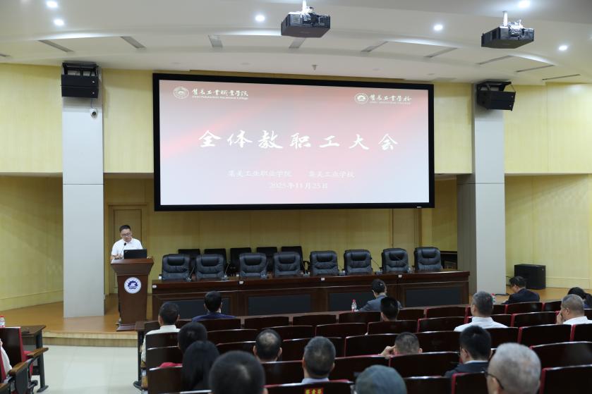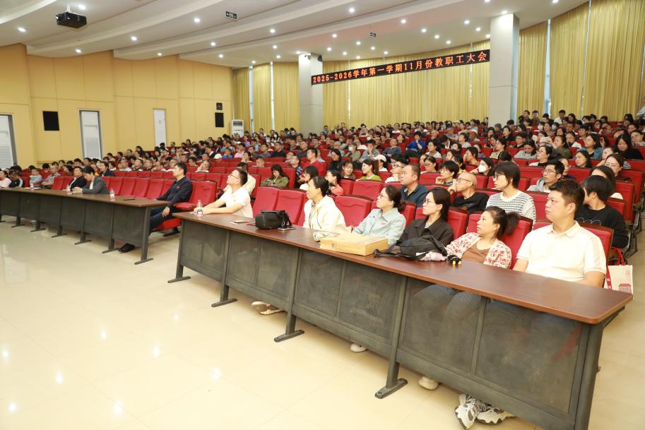 为统筹推进学校各项重点工作,深入学习贯彻党的二十届四中全会精神2025年11月26日下午我校在敬贤楼报告厅召开十一月份全体教职工大会。学校领导班子及全体教职工参加会议。会议由办公室副主任杨勇主持。