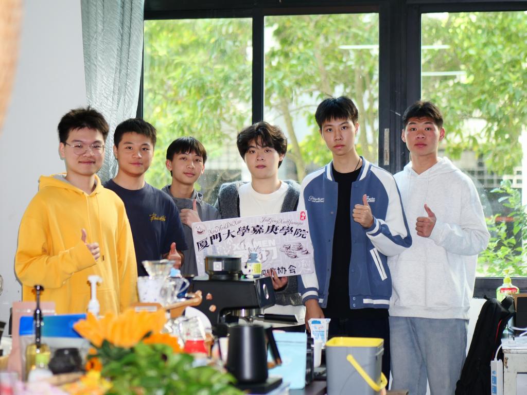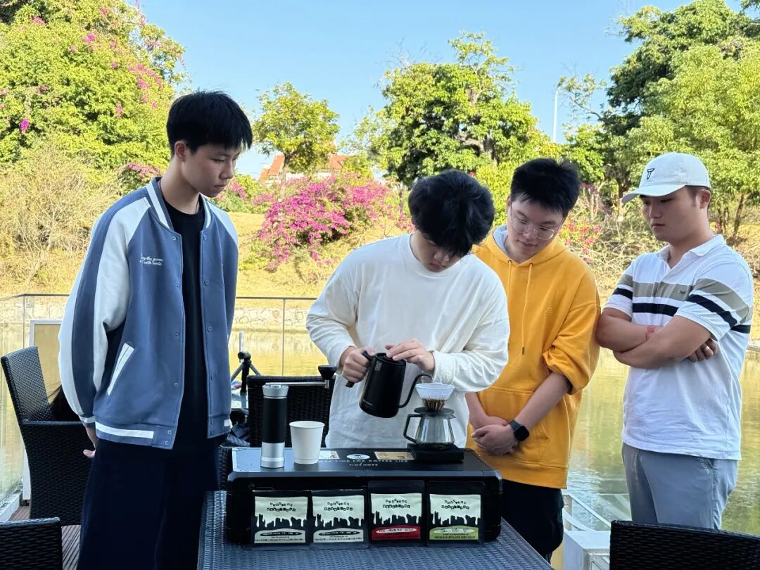 集工咖啡社长易哲宇带领叶荣杰、黄子龙、吴力康、庄进星同学,与嘉庚学院咖啡社的同学们一起进行手冲咖啡的分享与交流。