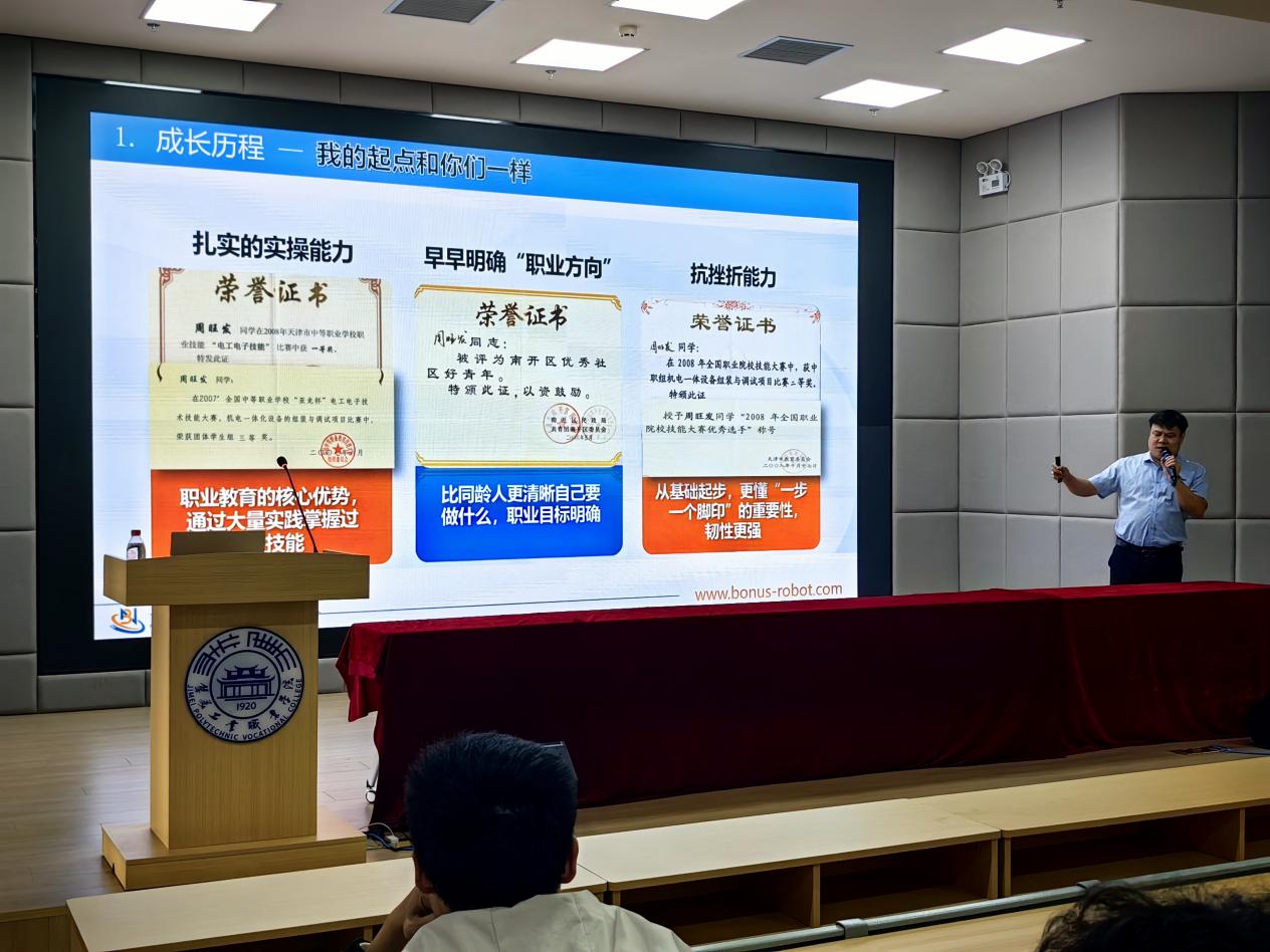 本次讲座嘉宾周旺发,是集“技能专家、企业家、职教导师”于一身的双栖人才:1988年出生的他,是中共党员、高级工程师、电工高级技师,现任天津博诺智创机器人技术有限公司总经理,同时担任天津职业技术师范大学研究生企业导师。