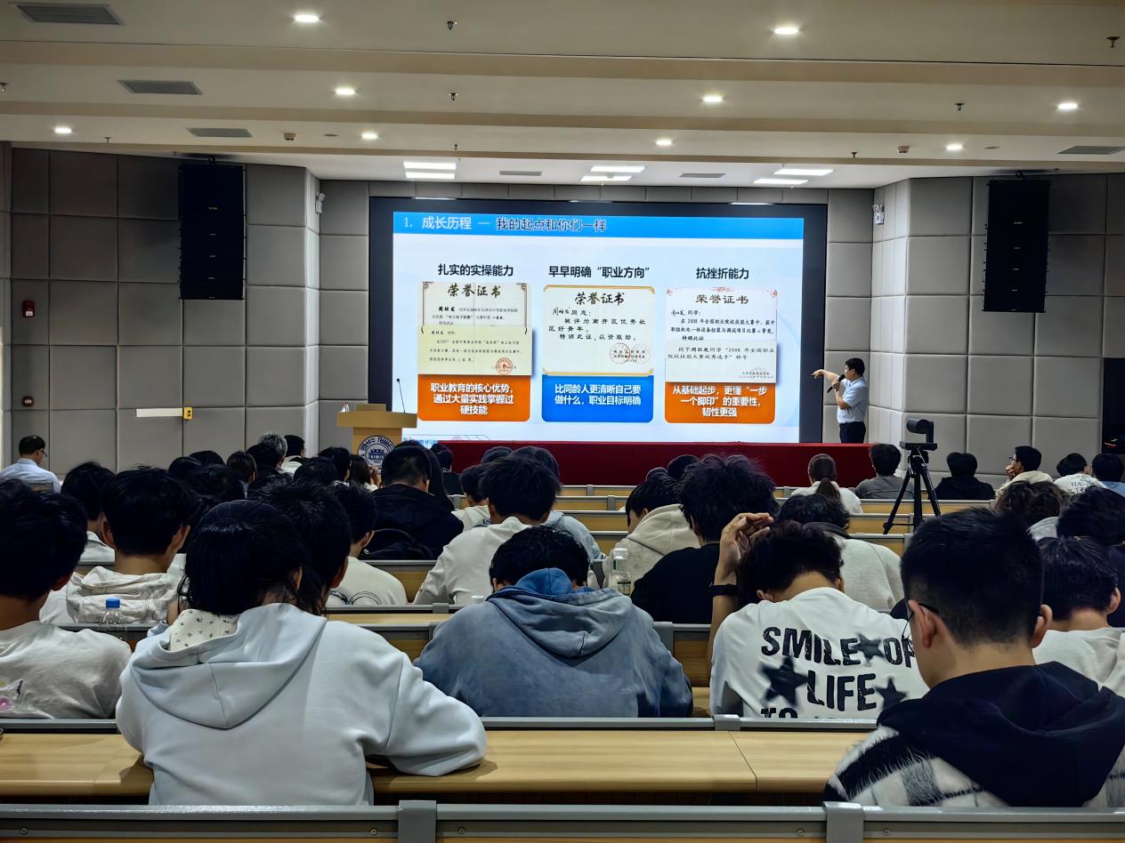 “技能是立身之本,学历是敲门砖而非天花板”“创业别盲目跟风,先练硬专业本领”……在经验分享环节,周旺发从技能学历、心态行动、职业规划三个维度,为学子送上“成长锦囊”。