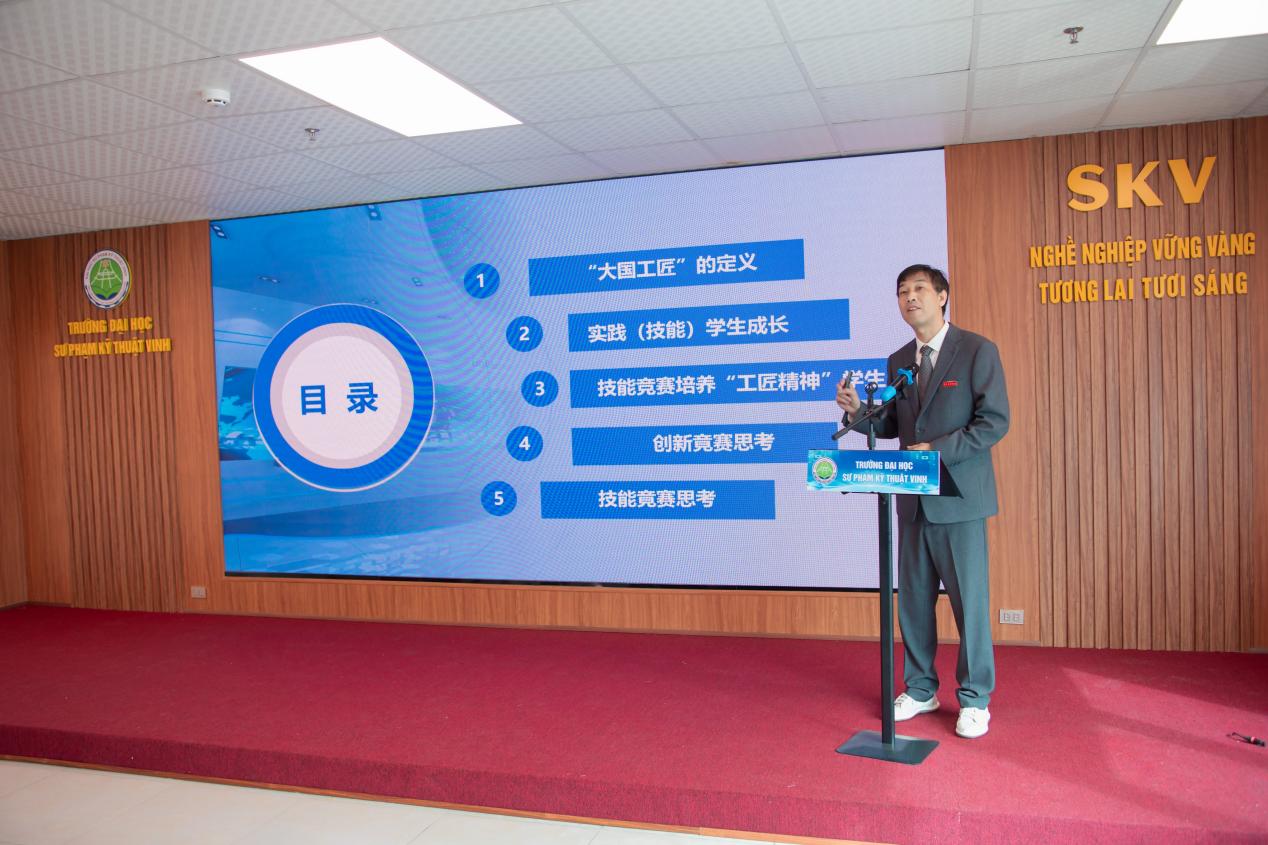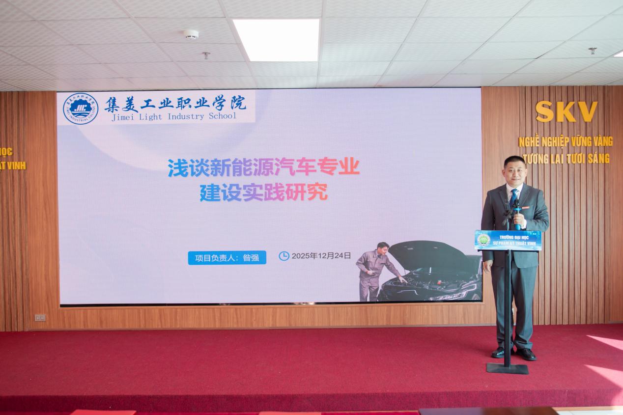 随后,福建省技术能手、正高级讲师昝强老师带来《浅谈新能源汽车专业建设思考》主题讲座,聚焦全球新能源汽车产业发展趋势,从专业定位、课程体系构建、实训基地建设、校企合作路径等方面,分享了我校在新能源汽车专业建设中的实践经验与创新思路,为越南高校相关专业发展提供了宝贵参考。