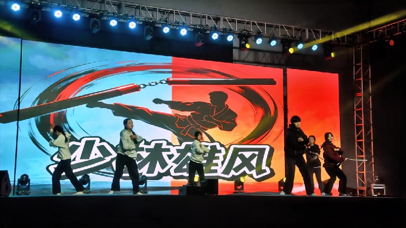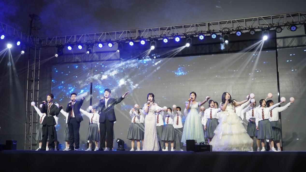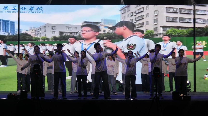 第二篇章“美勤绽彩・青春飞扬”中,《月上眉梢照水明》的古典舞婉约雅致,紧接着由厦门工商旅游学校带来的《少林雄风》双截棍与跆拳道表演,动作刚劲有力、整齐划一,双截棍在手中虎虎生风,破空之声响彻全场;随后,厦门信息学校带来的《春嬉》则以灵动柔美的风格形成鲜明反差,让观众仿佛置身于鸟语花香的春日郊野,沉浸式感受青春的灵动与美好。走秀与舞蹈《霓裳风华・踏歌行》将传统服饰之美与现代舞蹈之魅完美结合,合唱《熠熠的光》以温暖歌声传递向上力量。随后,本次联欢会的重要环节——班主任节感恩仪式温情举行,学生代表手捧鲜花,步履轻快地走向舞台,将满载感恩与敬意的花朵送到班主任手中。台下掌声雷动,班主任与学生紧紧相拥,这一刻,师生间的深厚情谊在温馨的氛围中静静流淌,成为联欢会上最动人的瞬间之一。
