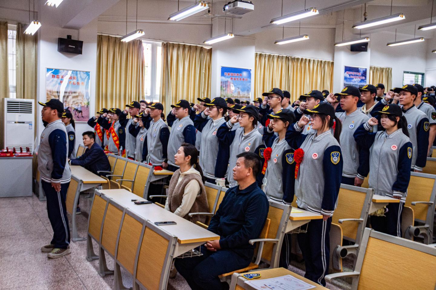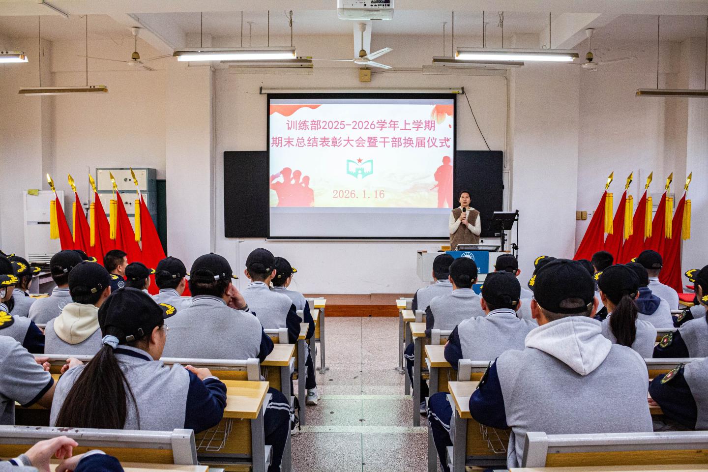 近日,我校教官组学生组织国旗队、训练部、体育部、摄影组、广播室分批自主组织开展期末表彰暨换届大会,各部门全程统筹流程、细化环节,规范完成干部新老交替与先进表彰工作。学生处主任吴锦欢、副主任陈桢楷出席各部门大会,指导教官及各组织全体成员参会,共同见证各部门薪火传承的重要时刻,为新学期工作开展凝聚奋进力量。