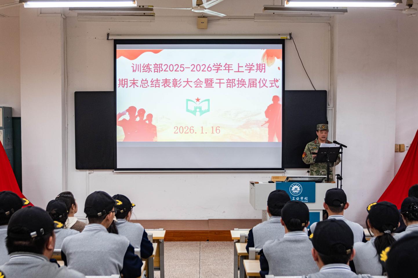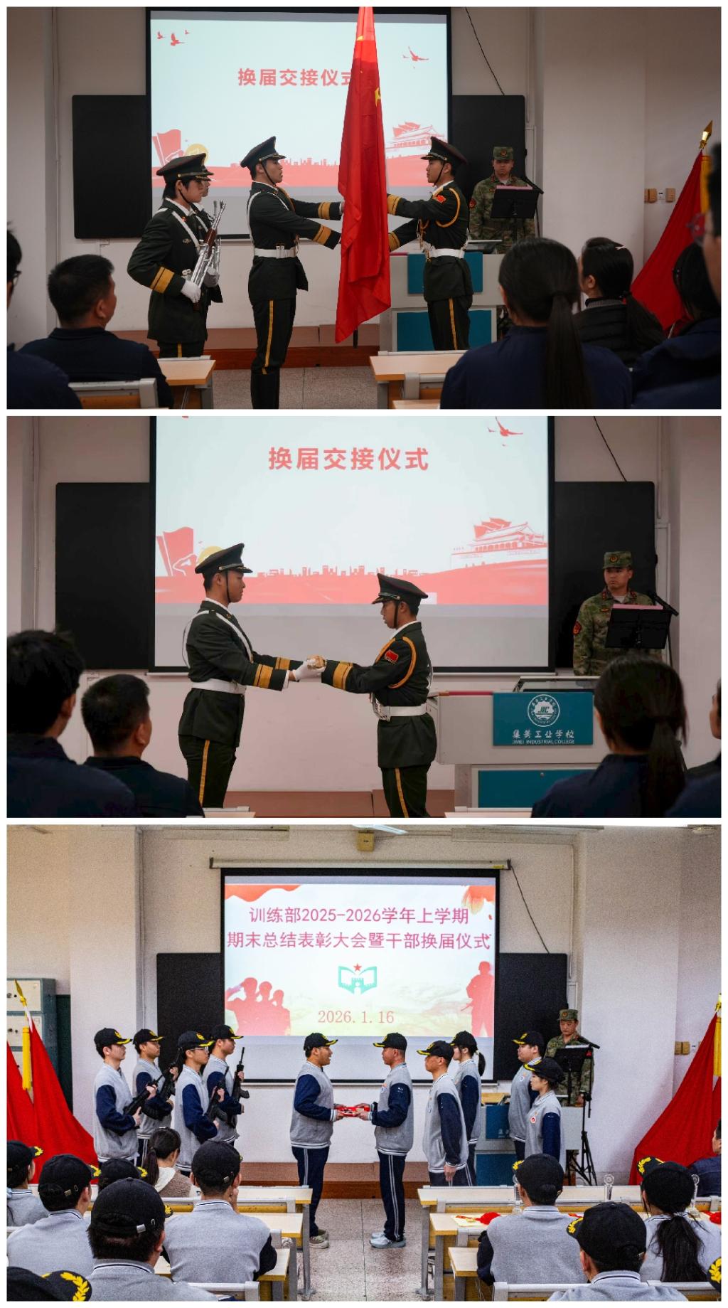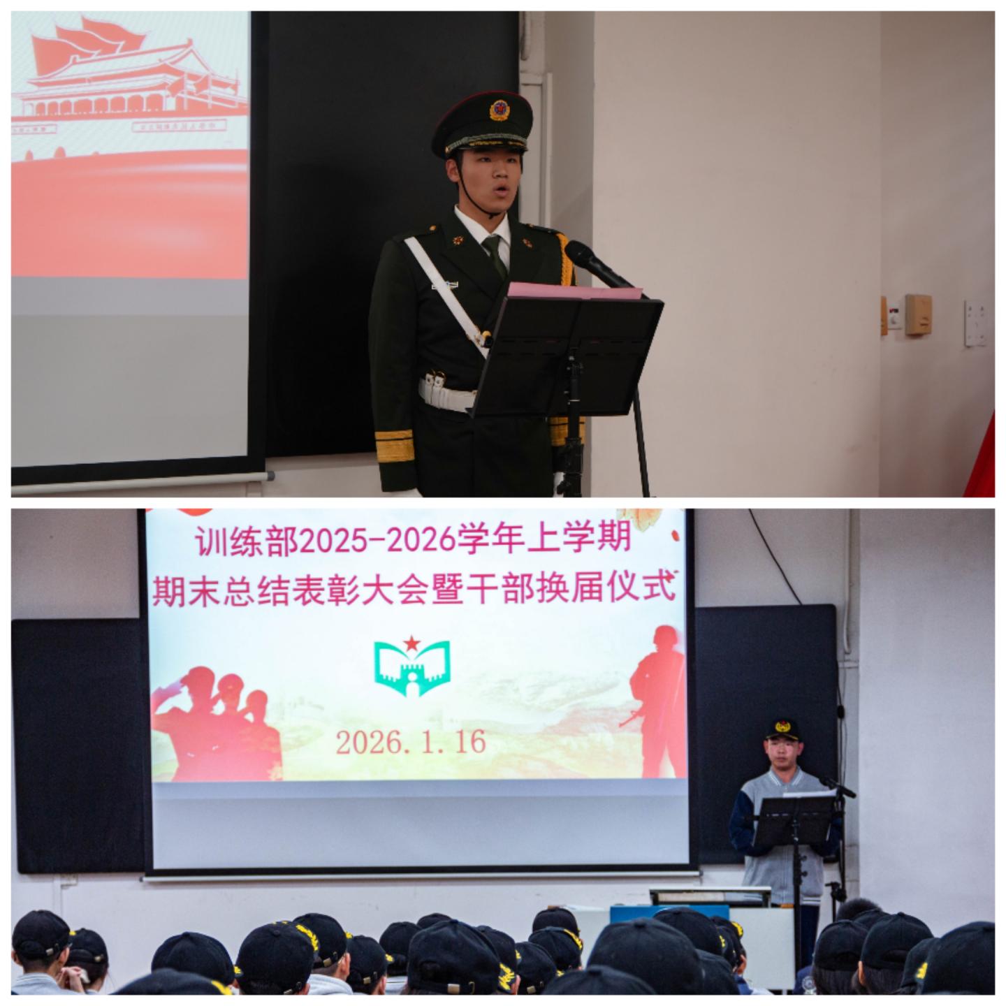 近日,我校教官组学生组织国旗队、训练部、体育部、摄影组、广播室分批自主组织开展期末表彰暨换届大会,各部门全程统筹流程、细化环节,规范完成干部新老交替与先进表彰工作。学生处主任吴锦欢、副主任陈桢楷出席各部门大会,指导教官及各组织全体成员参会,共同见证各部门薪火传承的重要时刻,为新学期工作开展凝聚奋进力量。