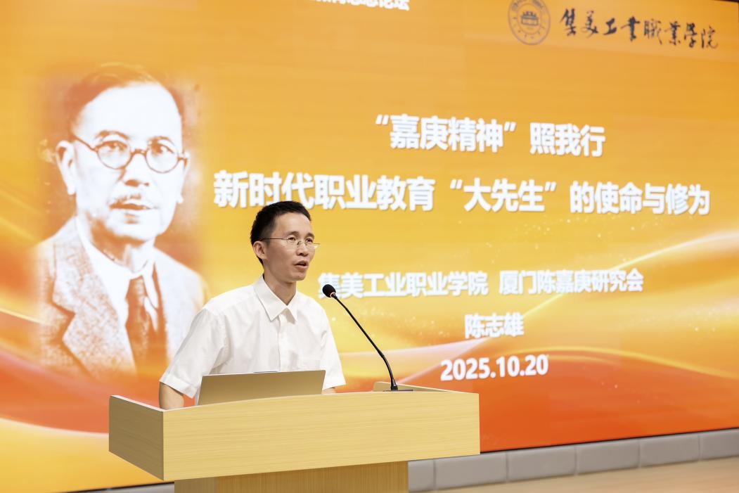 我校陈志雄老师以《“嘉庚精神”照我行——新时代职业教育“大先生”的使命与修为》为题,从一线教师的视角分享见解。陈老师强调,新时代职业院校教师应当以“忠公”锚定理想信念,以“诚毅”锤炼道德品格,努力成为学生成长的引路人。