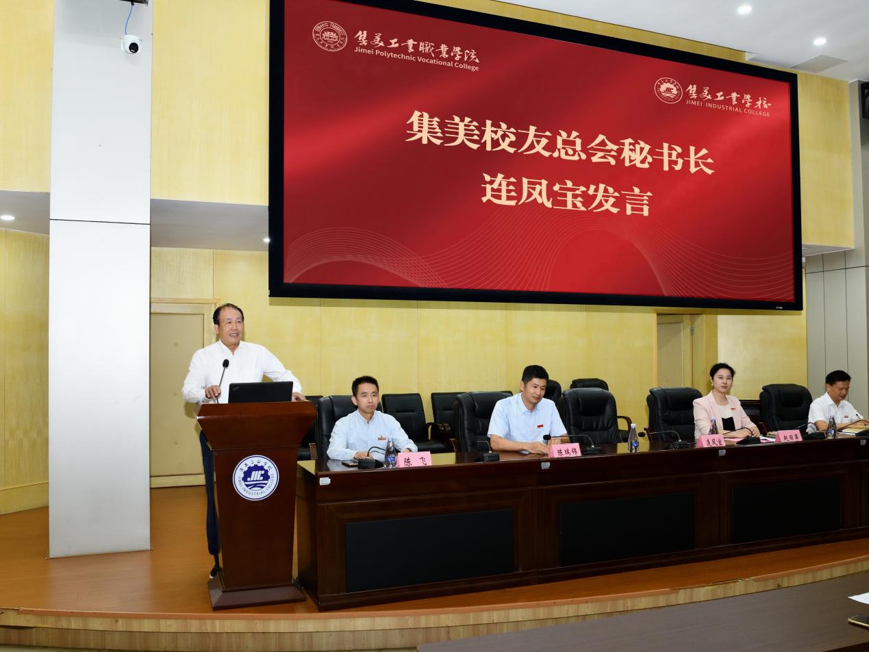 随后,集美校友总会秘书长连凤宝发表致辞。他代表集美校友总会向全校师生致以热烈的祝贺和崇高的敬意。连秘书长指出,今年学校实现办学层次的跨越,是办学史上一次辉煌的里程碑,标志着百年传承进入全新阶段。他回顾了学校105年来秉持“诚毅”校训,深耕职业教育,为国家培养了大批高素质技能人才,并强调集美校友总会始终以“服务母校、服务校友、服务社会”为宗旨。此次向学校捐赠十万元奖教金,既是对学校成功升格的祝贺,也是对全体教师辛勤耕耘的褒奖。他勉励学校在新起点上继续弘扬嘉庚精神,奋力建设一流高职院校。