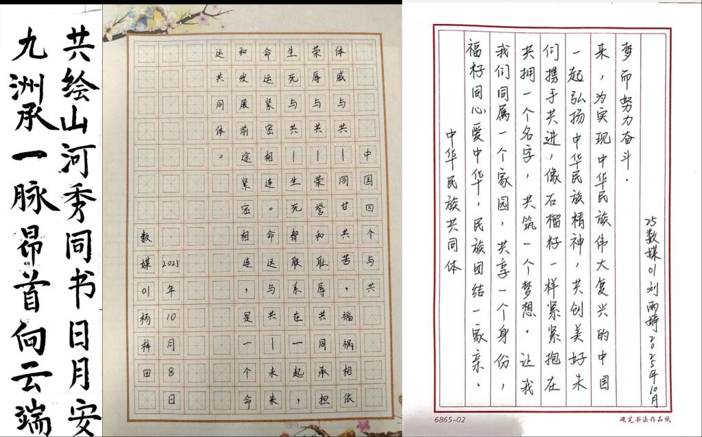 比赛自9月10日启动以来,通过班会课宣讲、资料推送、创作指导等方式,引导学生围绕“休戚与共、荣辱与共、生死与共、命运与共”的中华民族共同体理念“两岸同心”“共同梦想”等主题进行创作。学生们积极参考《中华民族共同体概论》、“道中华”平台经典论述等权威资料,结合自身书法基础,创作出一批内容深刻、形式多样的书法作品。
