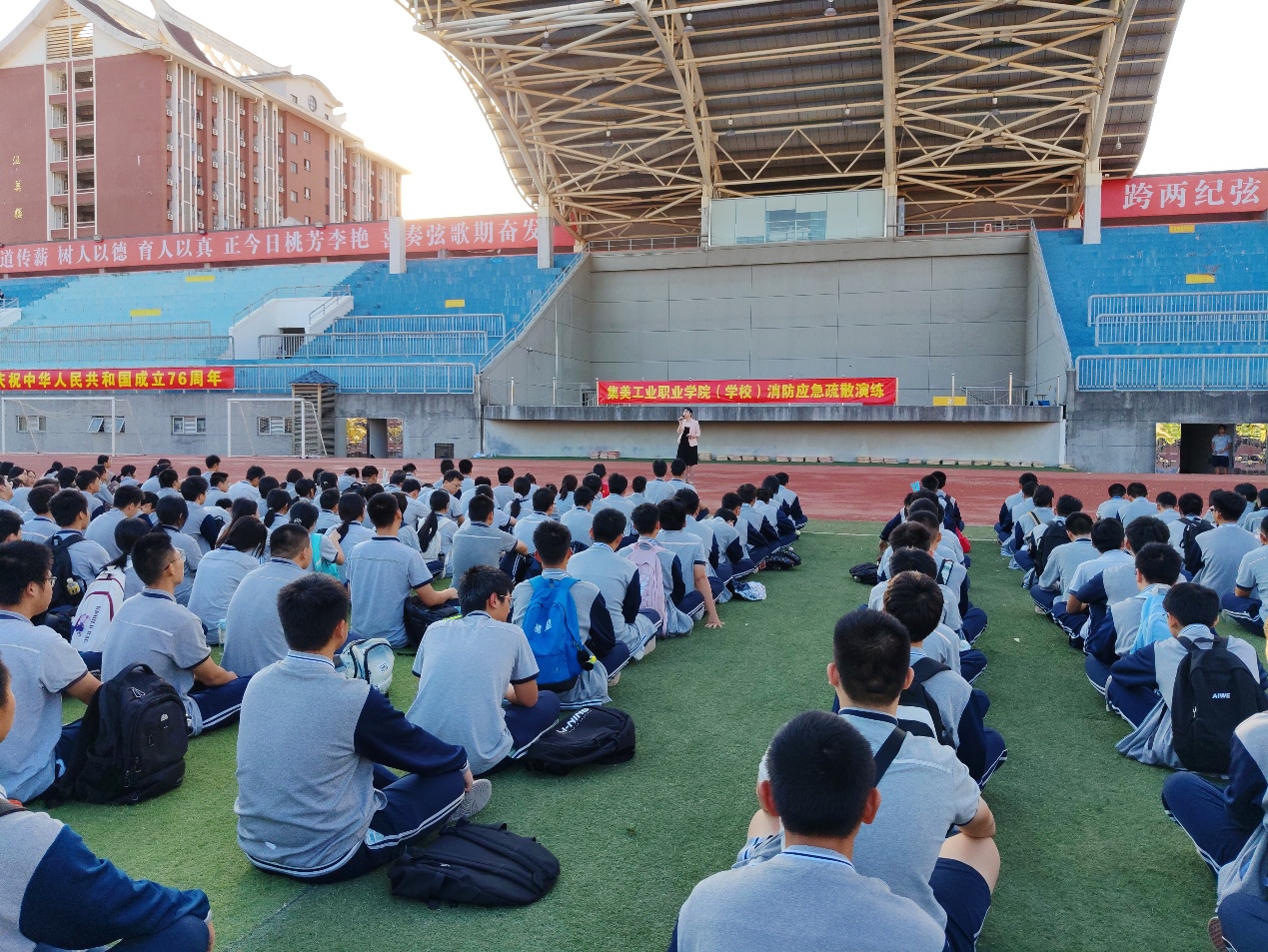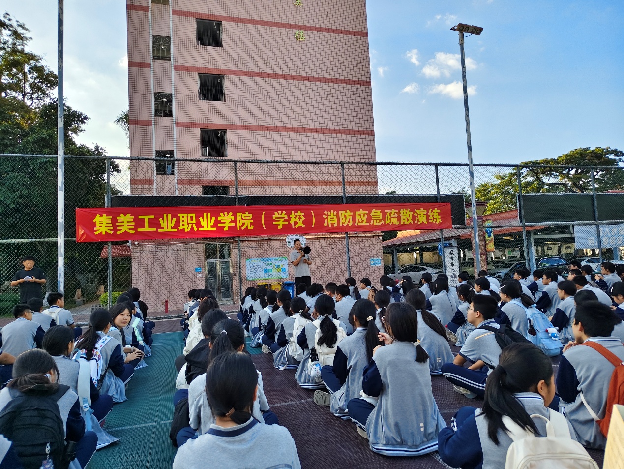 当日15时50分,尖锐的警报声划破校园的宁静,我校消防应急疏散演练正式启动。警报声就是命令,师生们迅速反应,按照预先规划的疏散路线有条不紊地撤离。诚敬楼、诚礼楼、诚毅楼、诚智楼、诚信楼、敬贤楼的师生,以及各实训区和正在上体育课的师生们,分别沿着指定的疏散路线,快速且安全地疏散至诚毅广场、灯光篮球场和田径场等安全区域。