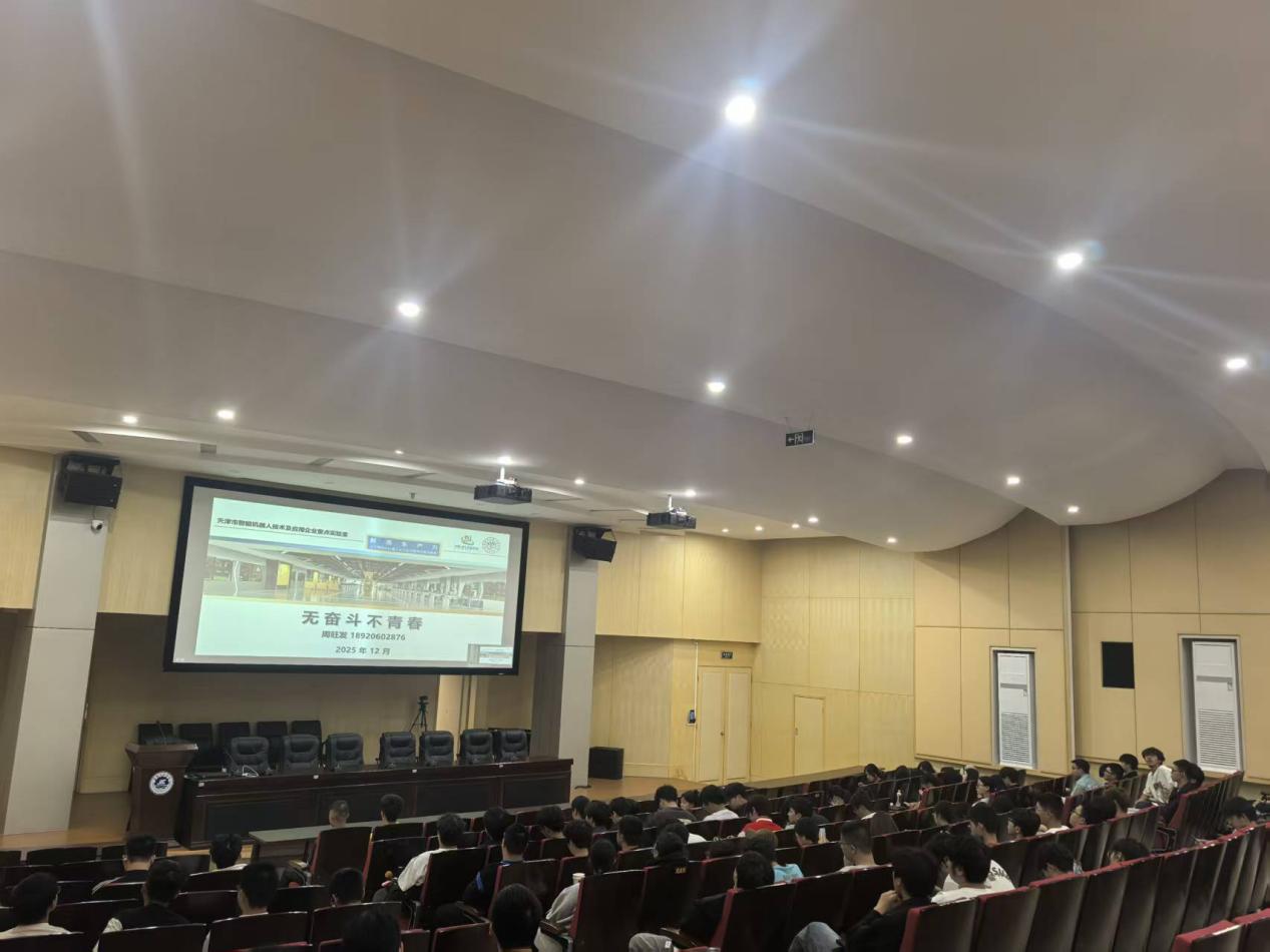 讲座中,周旺发总经理以“校园积淀—创业破局—成长感悟”为主线,用真实案例拆解奋斗逻辑:校园阶段,以“技能+实践”筑根基——他回忆,大学时主动突破舒适区,用VB编程开发软件控制小车拿下课题一等奖,在“互联网+”大赛中打磨团队协作力;同时抓住学校平台机遇,考取二级技师证书,为职业发展筑牢硬实力。创业初期,以“坚持+精准”破难题——毕业后与师生组建“2.5人”团队,在居民楼锚定自动化赛道起步,靠申报课题解决资金、凭技术与诚信拓展客户,最终实现从“小作坊”到“亿元级企业”的跨越。行业深耕,以“产教融合”拓价值——如今他的企业既是工业装备研发标杆,也是职教实践基地,曾在金砖国家技能大赛现场向选手发录用意向书,2025年还接待母校师生“访企拓岗”,持续衔接校园与职场。